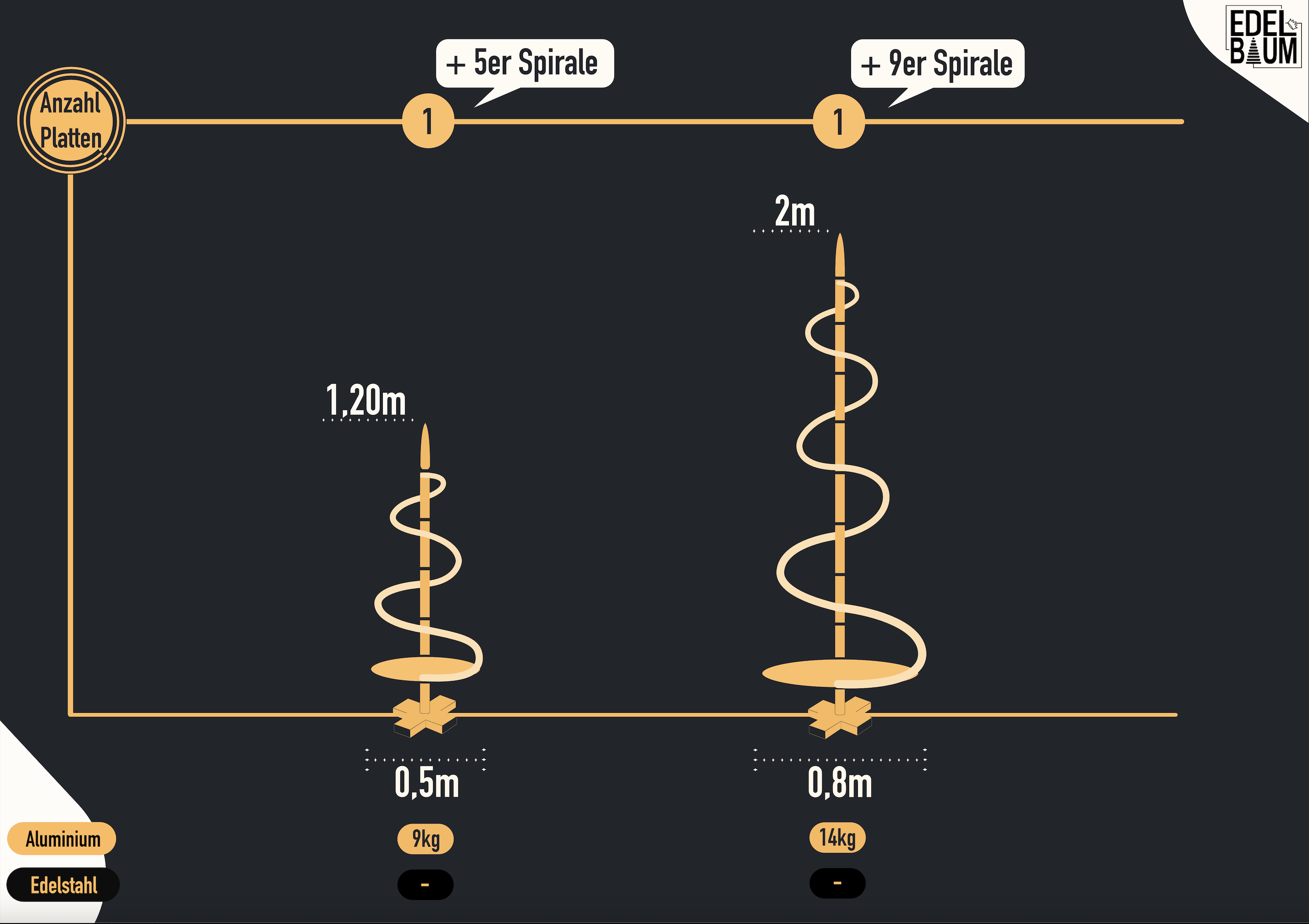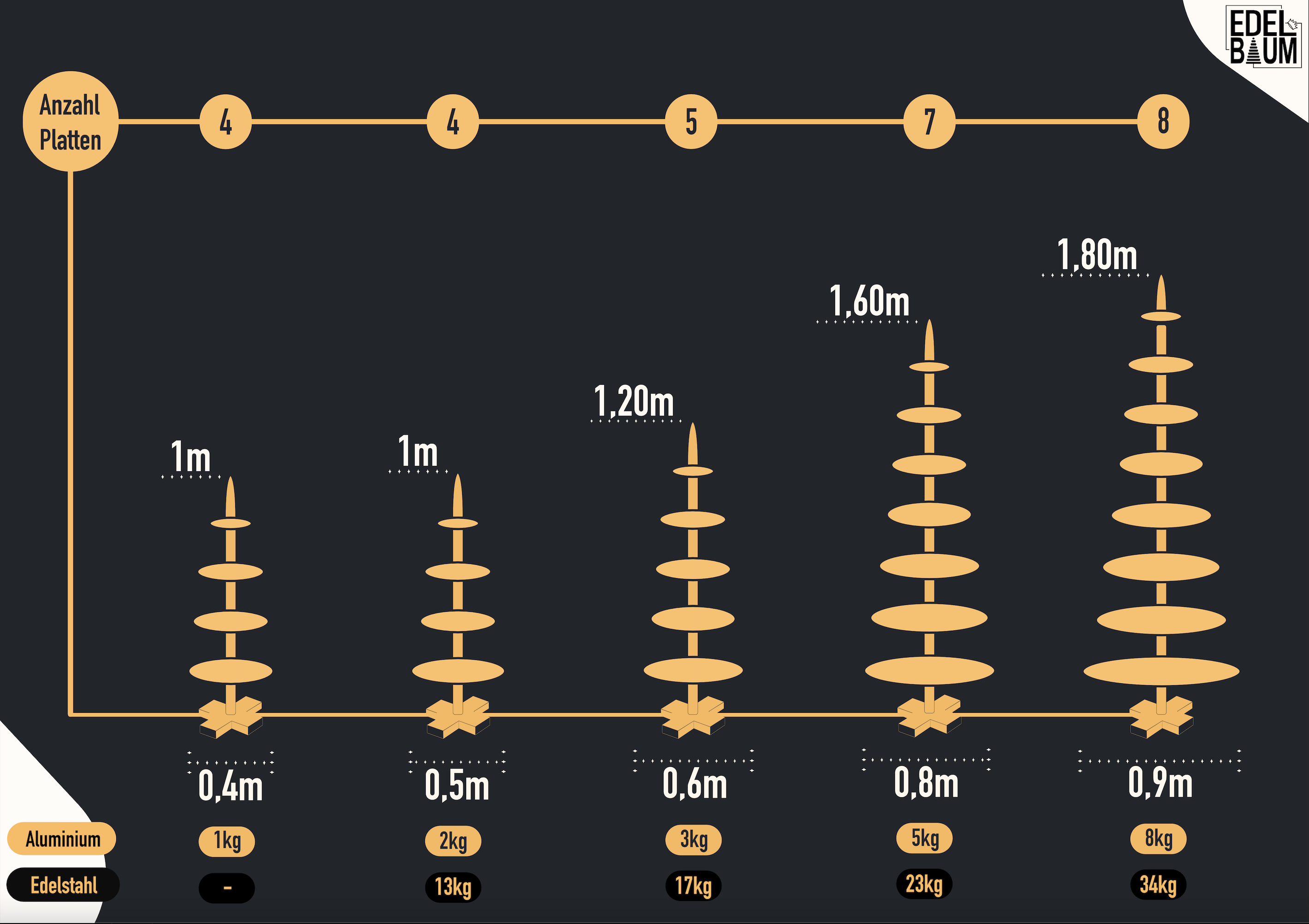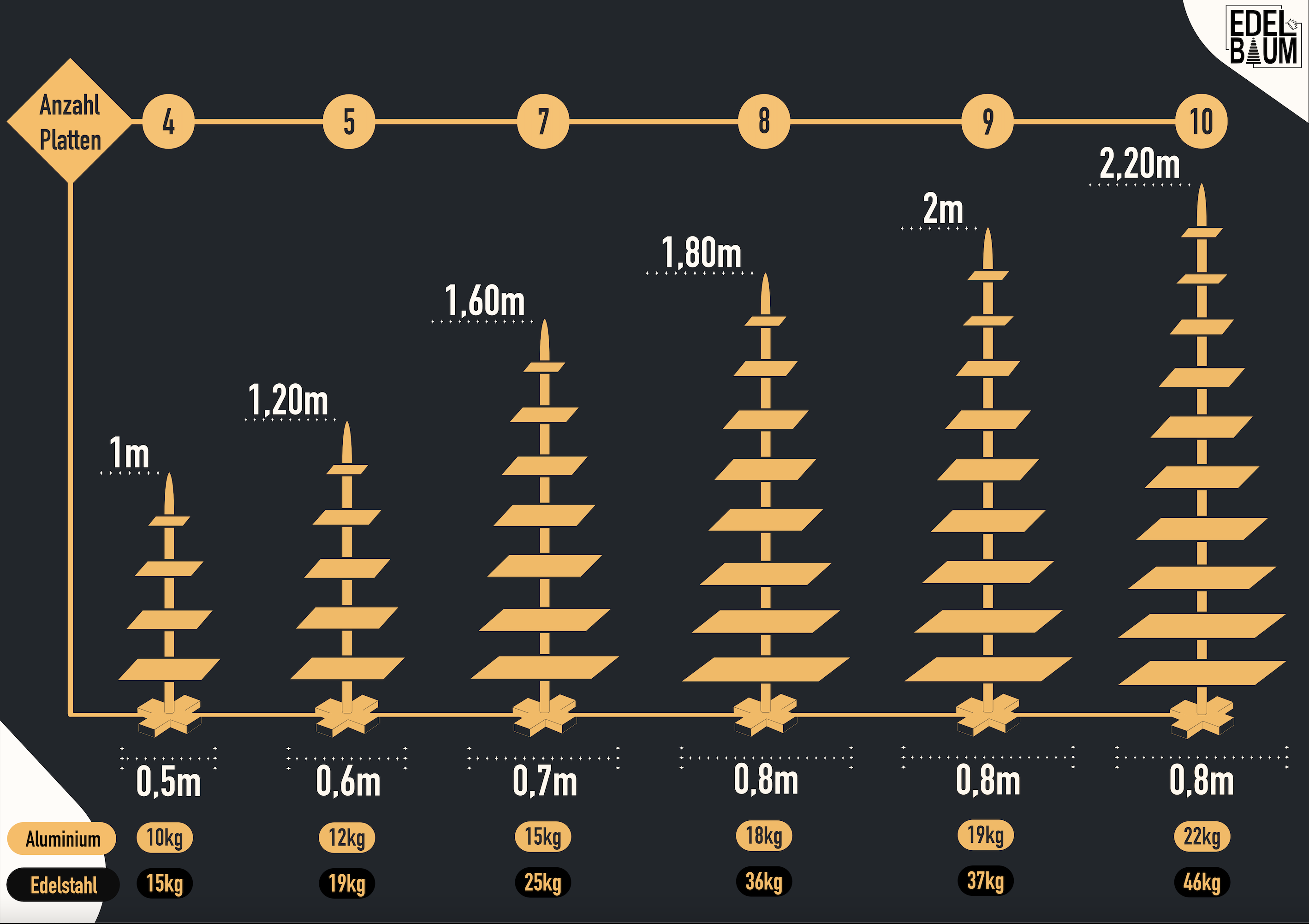 Diese Grafik soll dir dabei helfen, die modulare Aufbauweise unserer Edelbäume zu verstehen. Die Anzahl an Platten ergibt dementsprechend die Modellbezeichnung. Die Platten werden mittels Metallstangen zwischen zwei Platten Stück für Stück gestapelt. Somit kann man beliebige Größen und Formen kreieren. Das untere Metallkreuz, was alles aufrecht hält, bleibt für alle Modelle unverändert, während sich die Platten mit den größeren Modellen ebenfalls in ihrer Breite verändern.